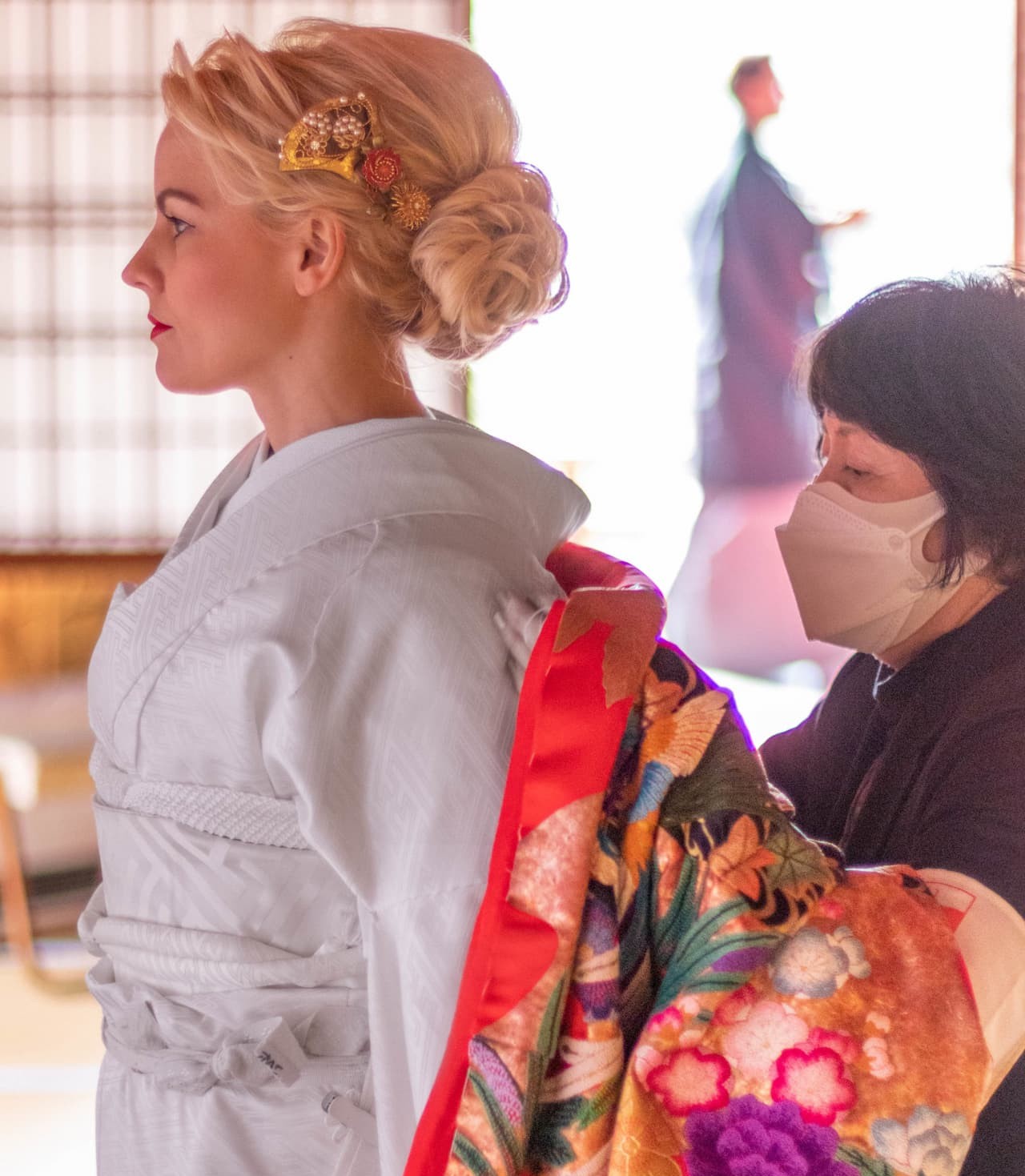 Le shiromuku, entièrement blanc immaculé, incarne la pureté absolue. Traditionnellement porté lors de la cérémonie elle-même, il symbolise la renaissance de la mariée qui entre dans sa nouvelle famille. Le blanc représente également une toile vierge, prête à adopter les couleurs de son nouvel environnement.